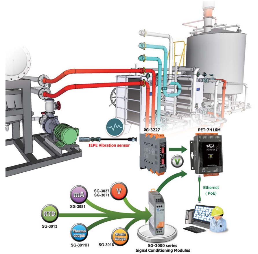 The ICP DAS SG-3000 series signal conditioning module supports a wide variety of sensors, including current, voltage, thermocouples, resistance temperature detectors (RTDs), strain gauges, and vibration (IEPE accelerometers). It filters, ...