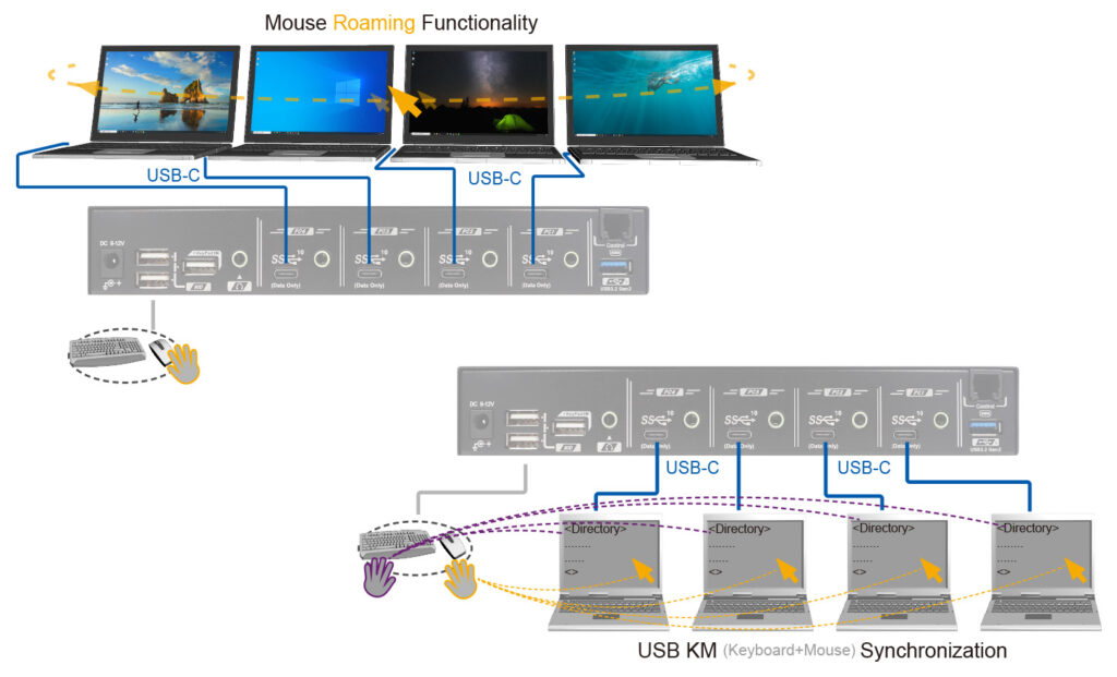 The Rextron USW-T334 USB-C Switcher allows the user to share one set of keyboard, mouse, 3.5mm audio, and 10Gbps USB peripherals among four USB Type-C Computers. The Real-time USB HID ...